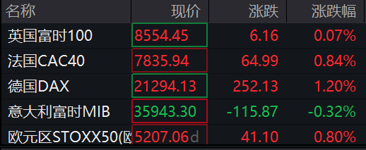德国DAX指数涨1.2%,英国富时100指数涨0.07%,法国CAC指数涨0.84%。